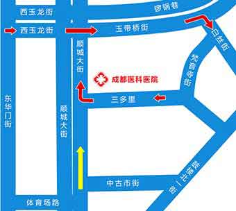 2、从富力中心前面的市青少年宫站出发,沿顺城大街向正南方走50米,左转过马路,再左转进入顺城大街辅路向北走280米即到成都医科医院。(途经公交:1路;52路;61路;64路;99路;夜间专线298路)